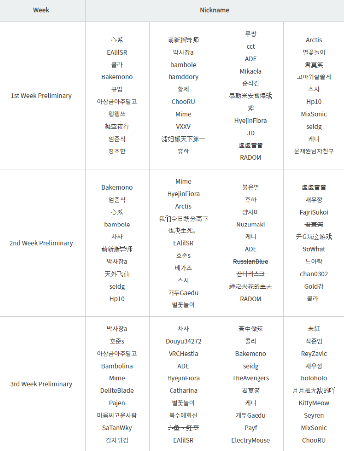 * Players who advance to the finals will be added after the end of each preliminary round for each week.