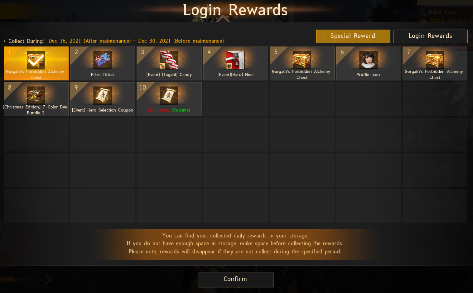 ■ Event Details - Go to Menu (ESC) → [Login Rewards] to check the attendance rewards. The rewards will be sent to your 'Storage' when you log in.