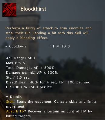 [Dev Note] Bloodthirst is a skill with a slightly long casting time, but it incapacitates (stuns) enemies in front of you for 1.5 seconds and steals their HP. Bloodthirst is a good choice if none of your party members have skills with bleed effects, or if you need to recover your HP. If low damage output is a source of concern for you, Bloodthirst can be used in tandem with other skills to make up for that, since it can stun enemies and inflict up to 500% damage. The skill has a long cooldown due to its versatility; however, this is subject to change as we will continue to monitor how the new skill fares in battles.