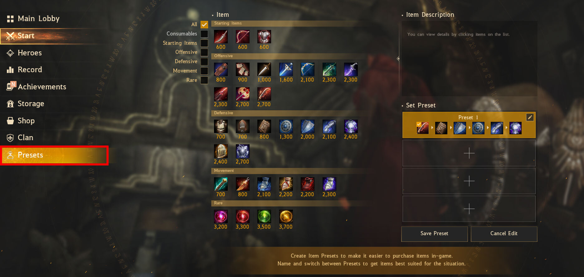 - Added a feature where you can save Item Presets. You can designate in which order you want to purchase items during a match.