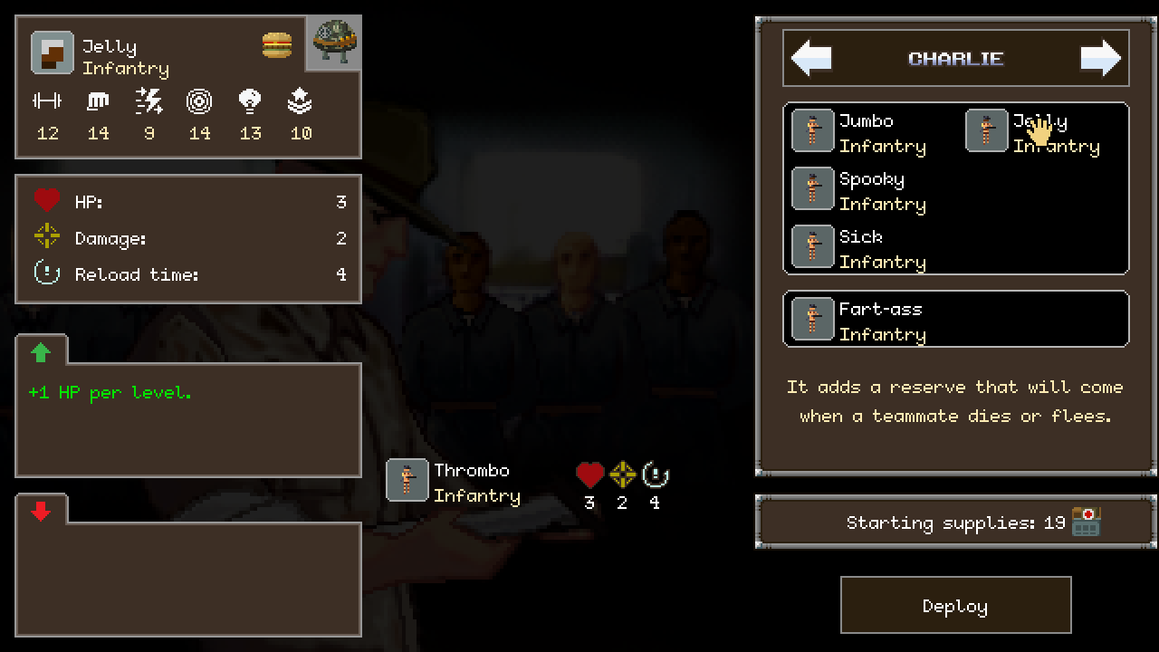 - Charlie: Add a recruit as a reserve; they join a platoon if a comrade dies or flees.