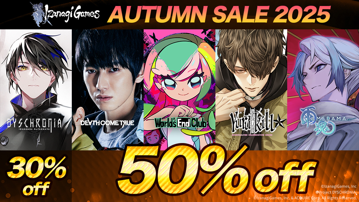 Titles on Sale 『Death Come True』50%off 『World's End Club』50%off 『Yurukill: The Calumniation Games』50%off 『AMEDAMA 』50%off 『DYSCHRONIA: CA 』30%off