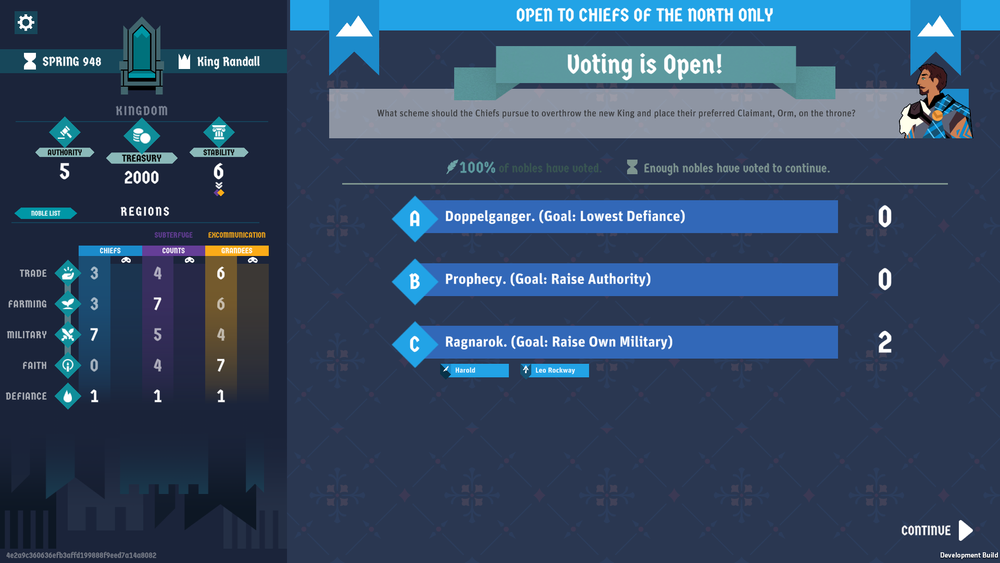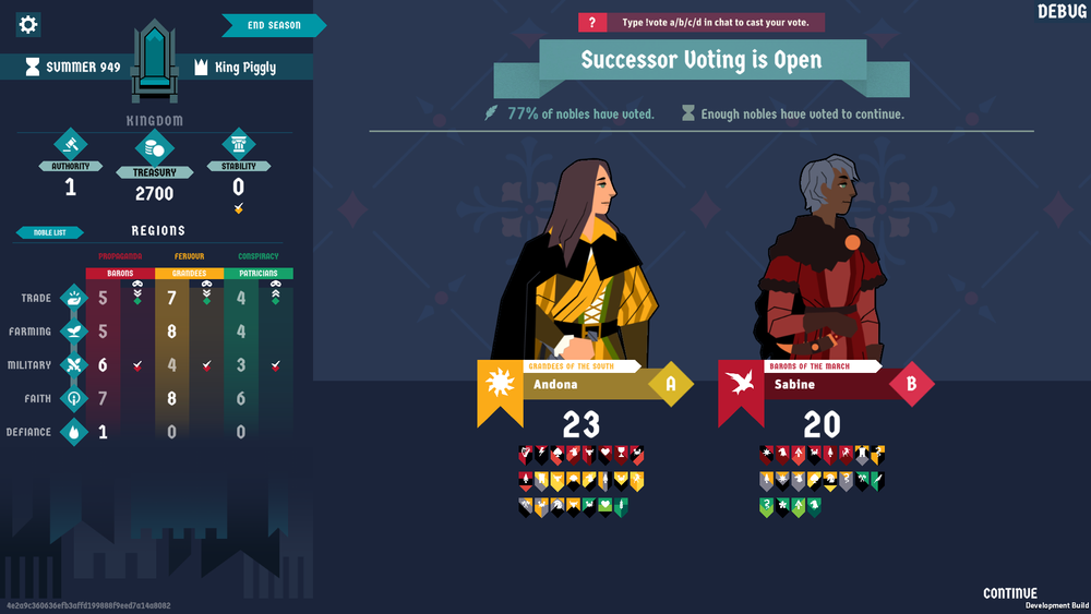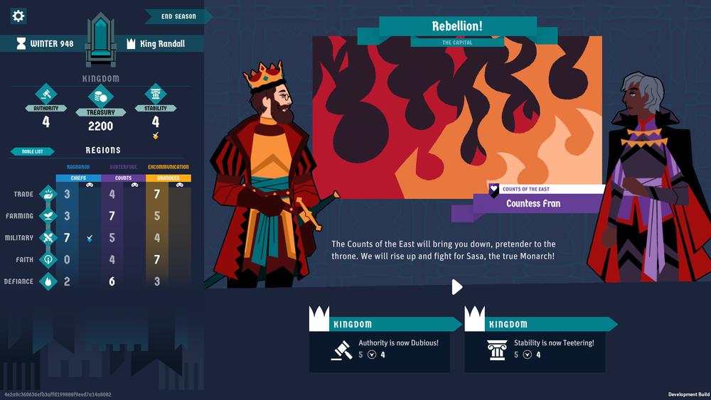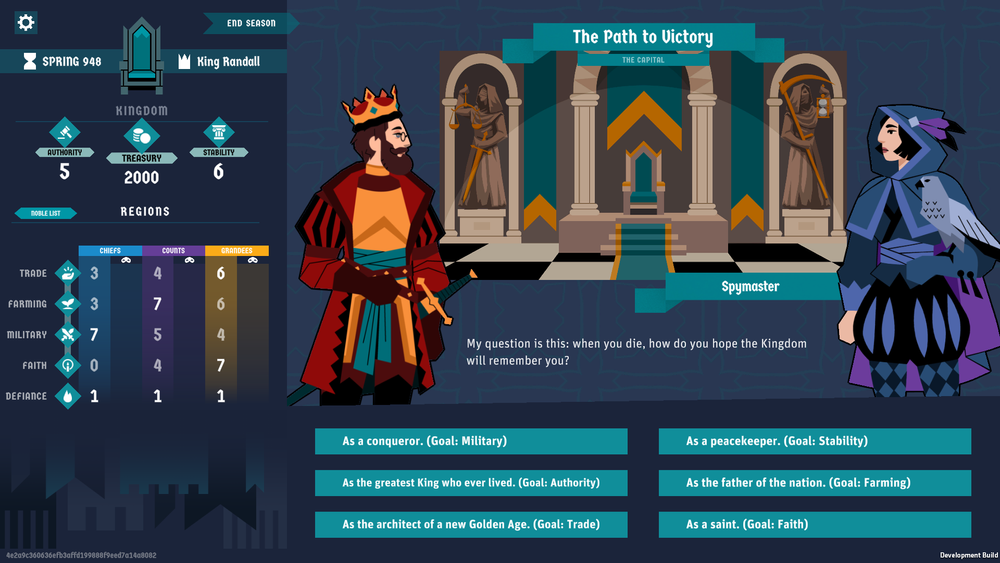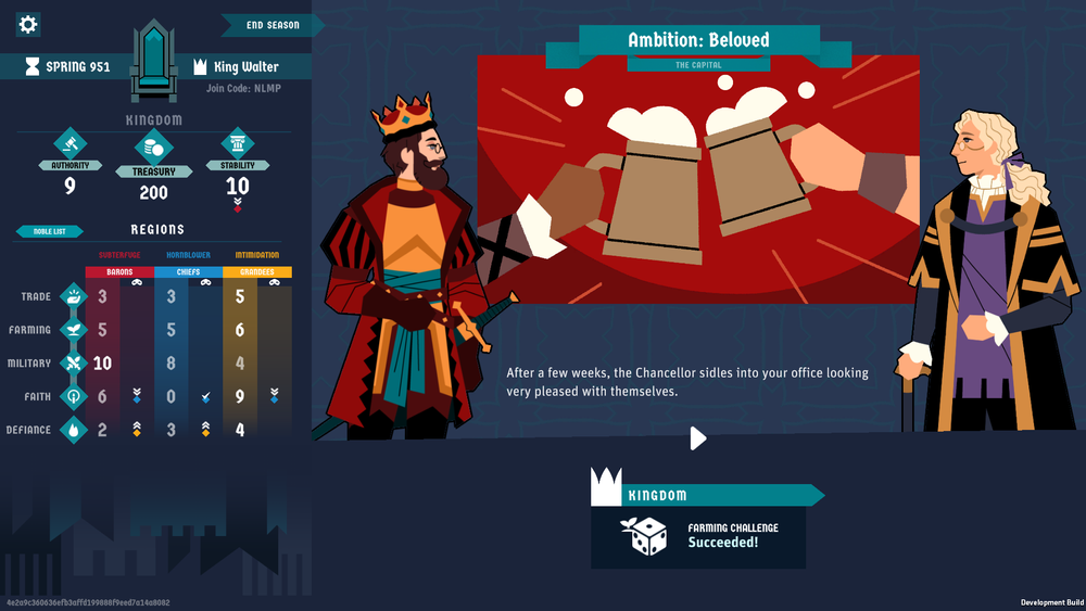 The outcomes of votes can increase or decrease these stats, and stat levels then influence which new events are generated for Nobles to vote on. This way, every new vote has a cascade of consequences as the fabric of the Kingdom changes over a Monarch’s reign.