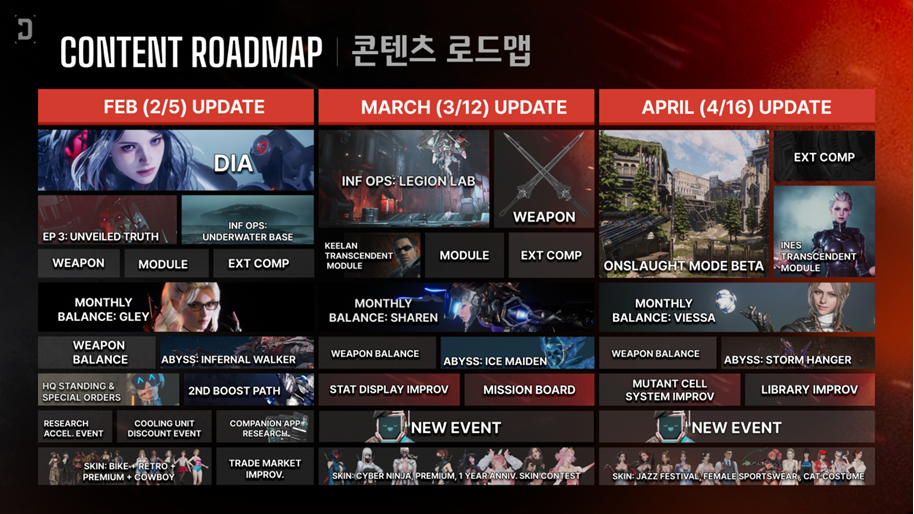 In this Developer Livestream, we shared various updates scheduled for the February 5th (Thu) update, including the new descendant Dia, the 'Exposed Underwater Base ' infiltration operation, new weapons and modules, balance adjustments for Gley and Kyle, the HQ Orders system, research feature for the Companion App, improvements to the Trade Market, and new skins along with February events.