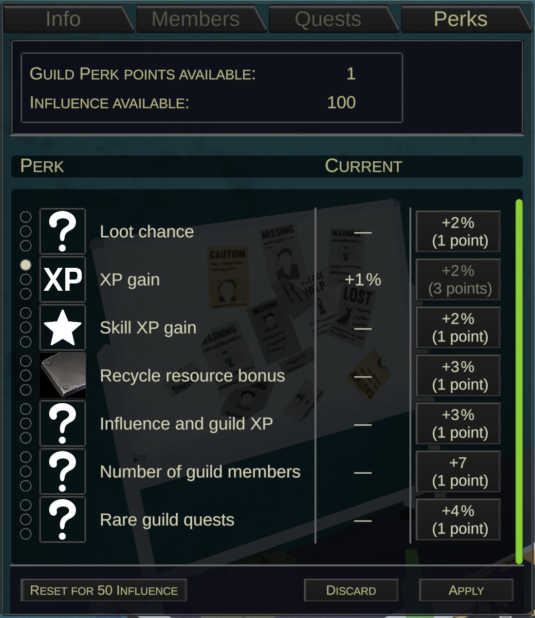 The chosen perks can be reset every 7 days to adapt to the current needs of the guild, but it will cost 50 influence.