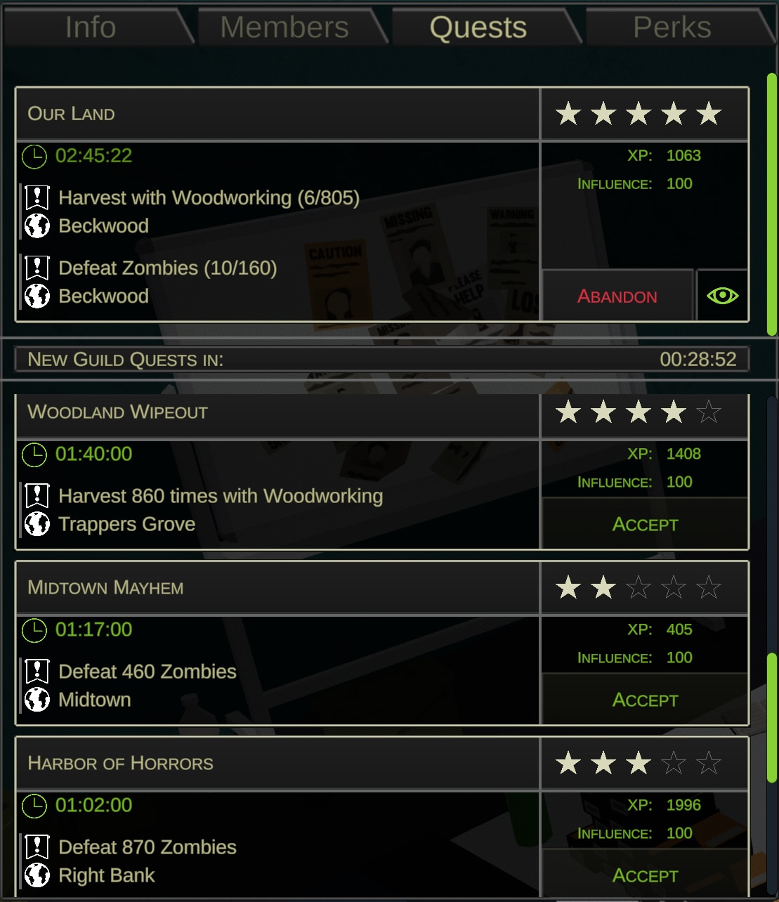 The quest tab unlocks once the guild has 4 members. A guild offers 12 randomly rolled guild quests, which can be accepted and completed. All quests renew every 30 minutes.
