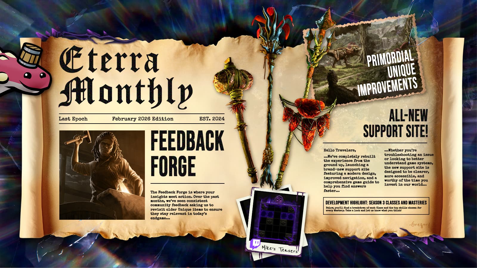 This has been Eterra Monthly, your report on the happenings and changes in the world of Last Epoch. We hope you’ve enjoyed this month’s update, and we’ll see you in Eterra when Season 4 launches on March 26th.